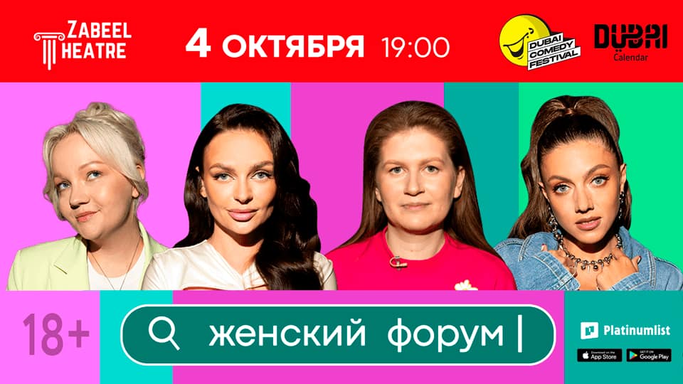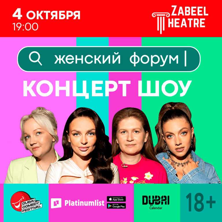 Women’s Forum at Zabeel Theatre in Dubai «Женский Форум» – шоу, в котором девушки дают советы по любым жизненным вопросам, хотя их об этом никто не просил. Варвара Щербакова, Александра Муратова, Ольга Парфенюк и Наталья Борисова разберут запросы пользователей с реального женского форума и прокомментируют их, подкрепляя это историями из своей жизни. Откровенно, потрясающе красиво и очень смешно – это всё про «Женский Форум»