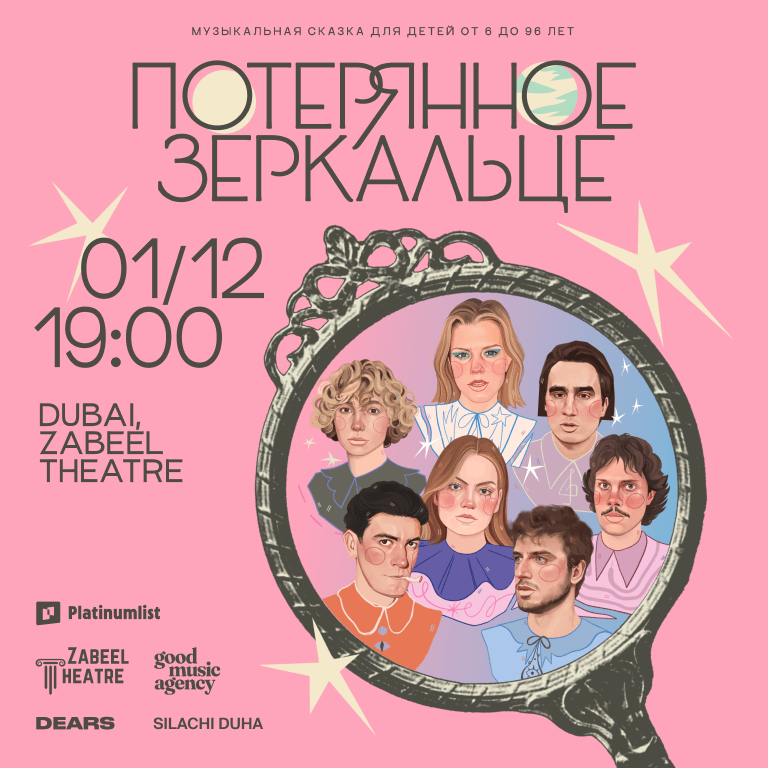 Lost Mirror / Потерянное зеркальце at Zabeel Theatre «Потерянное зеркальце» в театре Zabeel «Потерянное зеркальце» — это музыкальная постановка для взрослых и детей от 6 лет. В ней играют Александр Гудков, участники группы «Самое большое простое число» Евгения Борзых, Кирилл Иванов и Станислав Астахов, а также Марина Васильева, Доминик Мара и Серафима Гощанская. Действие на сцене происходит под музыку, которую специально для спектакля написала группа СПБЧ.  «Потерянное зеркальце» создано по мотивам произведений писателя и художника Павла Пепперштейна. И всё действие спектакля развернется на фоне видеодекораций с его иллюстрациями. Костюмы для спектакля, сюрреалистичные и «очень буквальные», создавала команда из нескольких стран под руководством художников Марии Левиной и Полины Гречко. Ручное зеркальце с осколком звезды на рукоятке будет ускользать от воров, вести беседы с Трюмо и Русалкой-профессором, попадет в плен Птицы-ныряльщицы и вообще побывает в самых неожиданных местах. Конечно же, зеркальце волшебное: оно помогает своим хозяевам увидеть, как можно осуществить большие и, казалось бы, невозможные желания. За время своих странствий Зеркальце — и зрители тоже — узнает новое о себе и окружающем мире: о существовании шоколадного зоопарка, сосисочного ридикюля, котят-садовников и многого другого. И главную истину: необязательно быть волшебным, чтобы с тобой случилось что-то волшебное. Музыкальный спектакль “Потерянное зеркальце” at Zabeel Theatre at Zabeel Theatre, Jumeirah Zabeel Saray Hotel, Dubai, United Arab Emirates events Shows and Theatrical Plays Zabeel Theatre – Jumeirah Zabeel Saray