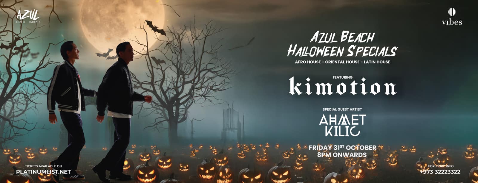 But the magic doesn’t stop there—Bahrain proudly welcomes back the renowned DJ and producer Ahmet Kilic, a multi-genre veteran celebrated for his high-energy sets and non-stop vibes. Known for seamlessly blending afro-house, Latin house, and progressive house, Ahmet will keep the dance floor alive till the early hours. And don’t worry if you don’t have a costume—our professional face painter will be on site to spook you up and get you in the Halloween spirit. This is your chance to experience an unmissable night of music, mystery, and pure beachside magic! Get ready for the Best Halloween Beach Vibes as we transform the shore into a spooky, creepy, and electrifying celebration like no other! For the very first time in Bahrain, the sensational French duo Kimotion will take the stage, bringing their signature afro house productions and oriental blends that have earned them worldwide recognition. With trending afrohouse hits like Shik Shak Shok, Dana Dana, Becane and more, their performance promises to deliver a hauntingly unforgettable night of global rhythms and thrilling energy under the stars. But the magic doesn’t stop there—Bahrain proudly welcomes back the renowned DJ and producer Ahmet Kilic, a multi-genre veteran celebrated for his high-energy sets and non-stop vibes. Known for seamlessly blending afro-house, Latin house, and progressive house, Ahmet will keep the dance floor alive till the early hours. And don’t worry if you don’t have a costume—our professional face painter will be on site to spook you up and get you in the Halloween spirit. This is your chance to experience an unmissable night of music, mystery, and pure beachside magic! Azul Beach Halloween Specials Featuring Kimotion & Ahmet Kilic at Azul Beach Bahrain events Halloween Azul Beach Bahrain Kimotion