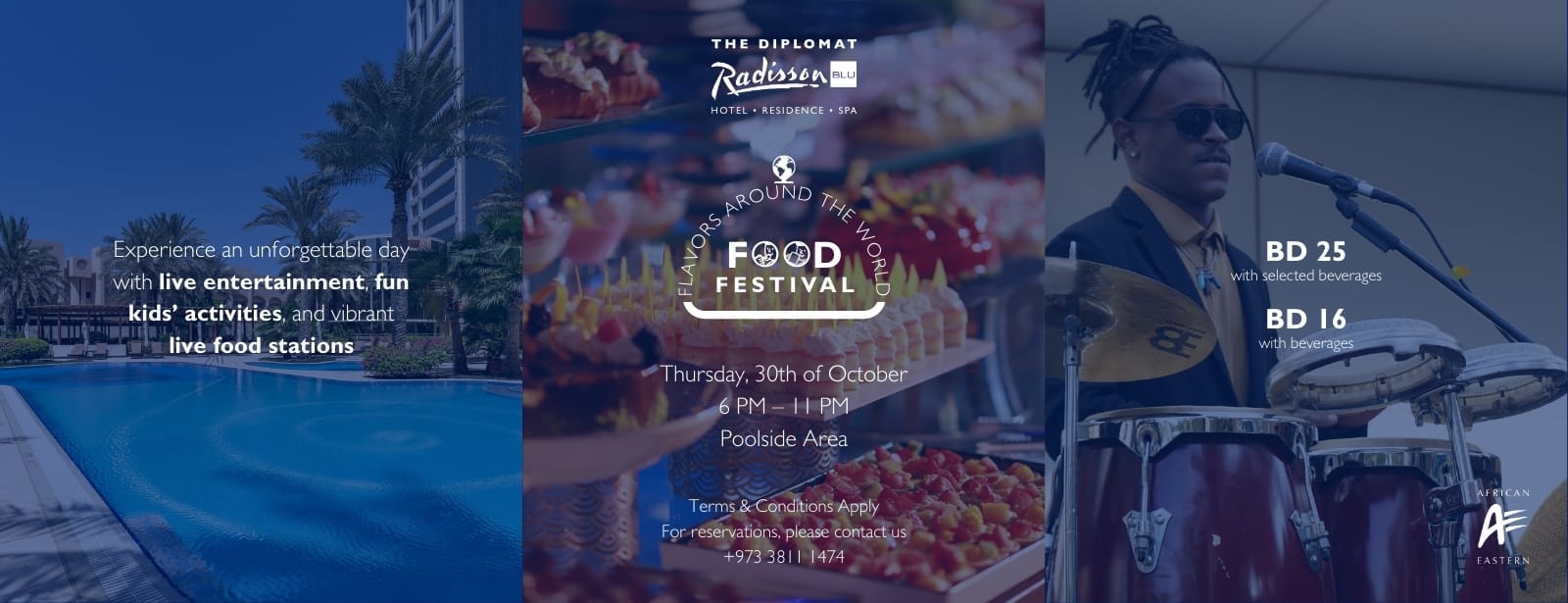 Alongside the food, the evening will be filled with live entertainment, fun kids’ activities, and an energetic ambiance, making it the perfect outing for all ages. Whether you’re coming for the delicious dishes, the music, or simply the great vibes, the festival promises a memorable night of culture, flavor, and celebration. Mark your calendars for Thursday, 30th October, from 6 PM to 11 PM and be part of this extraordinary event by the pool. Get ready to indulge in a global culinary journey at Flavors Around the World Food Festival, hosted at the stunning poolside of The Diplomat Radisson Blu Hotel. This vibrant event brings together international cuisines, live food stations, and refreshing beverages, creating an unforgettable dining experience under the stars. Guests can savor unique flavors while enjoying the lively atmosphere surrounded by family and friends. Alongside the food, the evening will be filled with live entertainment, fun kids’ activities, and an energetic ambiance, making it the perfect outing for all ages. Whether you’re coming for the delicious dishes, the music, or simply the great vibes, the festival promises a memorable night of culture, flavor, and celebration. Mark your calendars for Thursday, 30th October, from 6 PM to 11 PM and be part of this extraordinary event by the pool. Flavors Around The World: Food Festival at The Diplomat Radisson Blu Hotel, Residence & Spa at The Diplomat Radisson Blu Hotel, Residence & Spa, Manama, Road No 1701, Manama, Bahrain events Festival The Diplomat Radisson Blu Hotel, Residence & Spa