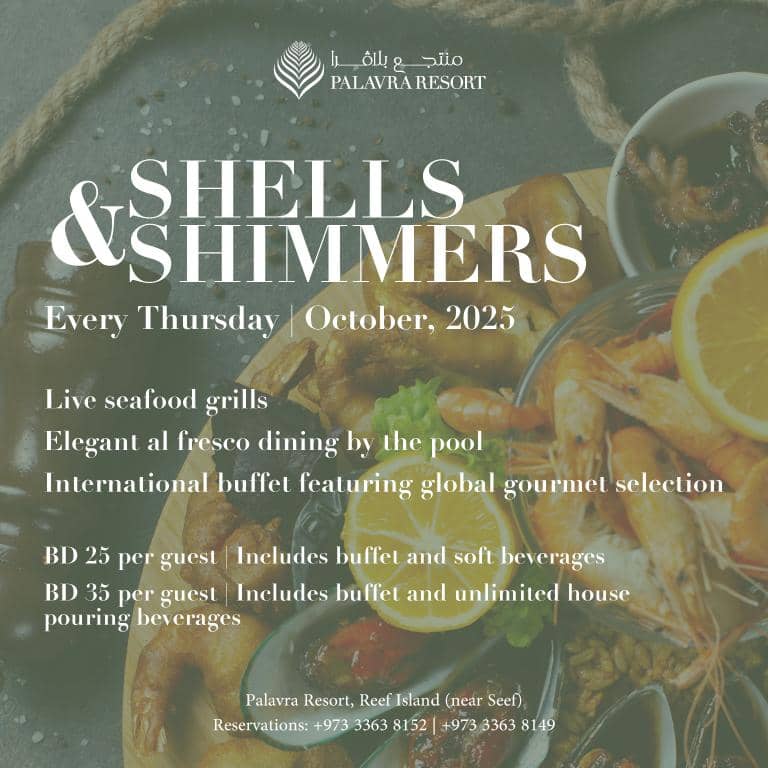Set against the serene backdrop of Reef Island, this is more than just dinner – it’s a celebration of the sea. Dive into an unforgettable evening at Pool Delight Restaurant, where the ocean meets your plate. Guests can indulge in a lavish seafood extravaganza featuring live grills, a sumptuous international buffet spread, and the freshest catch sourced right from Reef Island itself. Set against the serene backdrop of Reef Island, this is more than just dinner – it’s a celebration of the sea. Shells & Shimmers at Palavra Resort, Bahrain at Block 346 Building 2951 Rd 4652, Manama, Bahrain events Nightlife Palavra Resort, Reef Island